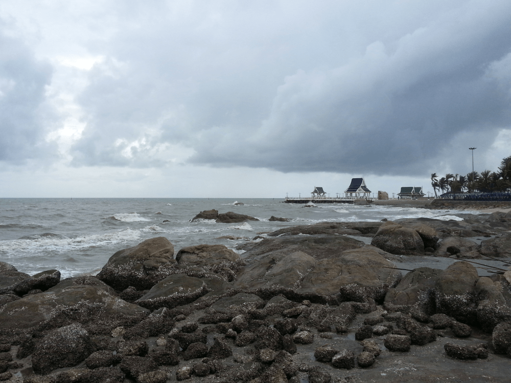 We finally arrived at the beach and sat and ate lunch (homemade crab fried rice, plus papaya salad and Thai barbecue chicken). I got the chance to put my feet in the water and relax for a little while, but eventually the wind and rain drove us away. We rode further down the shore to see more of the area.